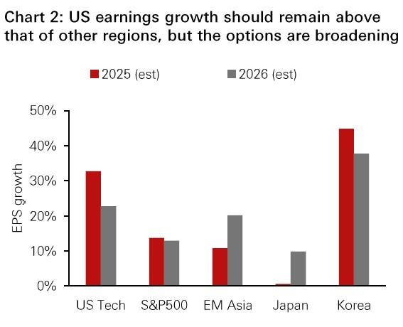 • AI adoption and domestic consumption are twin tailwinds for Asia. In South Korea, strong memory demand, solid earnings expectations and the Corporate Value-Up programme justify our overweight stance. Japan is also upgraded to overweight, supported by a re-rating opportunity linked to the new Prime Minister’s agenda, governance reforms and record-high share buybacks. These upgrades complement our preference for mainland China, Singapore and Hong Kong, as well as Asian investment grade credit, reflecting the positive momentum in the region.