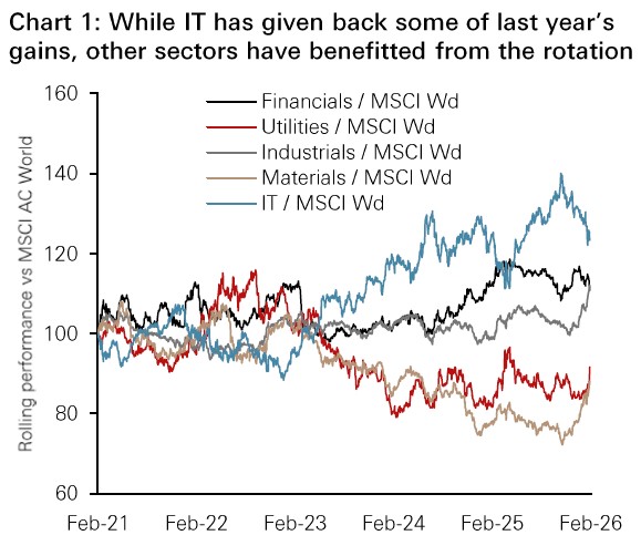• The recent market sell-off was triggered by concerns that incumbent software companies could be replaced by AI start-ups. We believe these fears are  exaggerated, as these companies are also well positioned to benefit from AI for greater efficiency. The investor rotation from IT to other sectors broadens opportunities in industrials, materials and utilities. A multi-asset solution will help diversify across asset classes, sectors, markets and currencies.