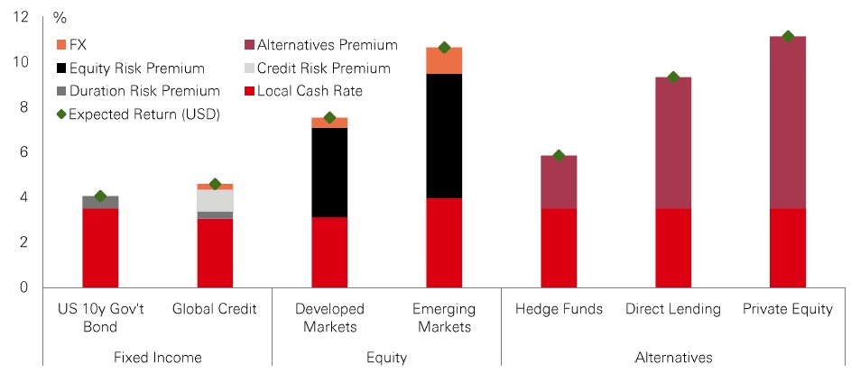 Meanwhile, corporate bond returns look less appealing than they did in the recent past. But for investors worried about the hedging properties of the US dollar assets, they are increasingly seen as bond substitutes. Many alternative asset classes also appear potentially attractive for long horizon investors, offering the possibility of superior returns and portfolio diversification.