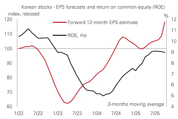 Amid the global enthusiasm for AI, South Korea’s stocks have been a big beneficiary. This isn’t surprising given the market’s high exposure to big tech and semiconductor names, and a starting point of robust profits and valuation discounts in the sector. A US trade deal has helped too. But it’s also worth looking at some important ongoing reforms, which could be paying off. Efforts to enhance corporate accountability and market practices, building on last year’s “Value-Up” programme, have accelerated under the administration’s commitment to corporate reform. Profits – as measured by return on equity – have since picked-up. This suggests that the so-called “Korea Discount”, driven by corporate governance concerns and weak profitability, could melt away. |