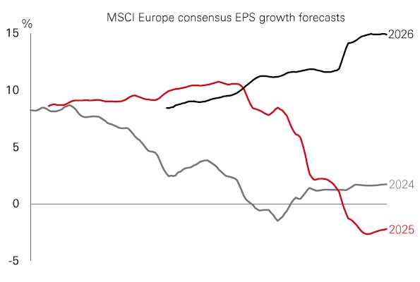 Europe isn’t a major participant in the AI boom, but sectors like industrials could benefit. There may also be value in defensives like Swiss healthcare and staples, and areas like UK financials, materials, energy, and healthcare. European stocks trade close to a long-term average PE of 14.5x, but there are signs of value, and scope for upside if 2026 EPS growth comes close to target expectations.