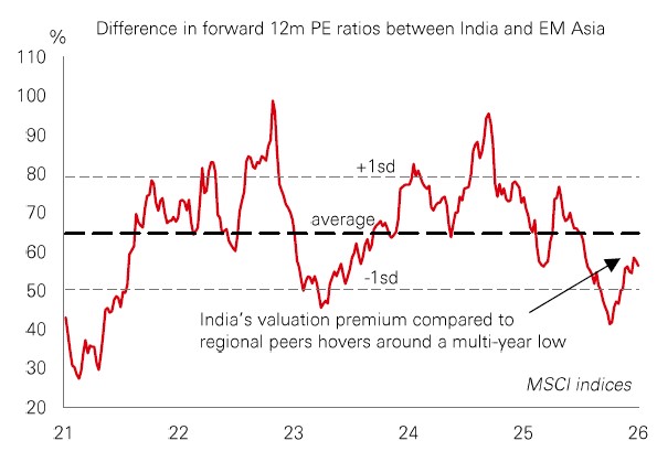 With GDP growth and profits momentum picking up in Q3 last year, there are signs of a recovery. And while US-India trade remains uncertain (with a deal potentially a catalyst), India’s relatively insulated economy and macro stability should offer protection. Earnings growth and improving return on equity are key drivers of its market returns, and after a period of downgrades, expectations are stabilising.