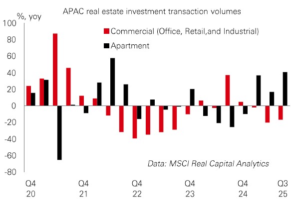 After a subdued start last year, investment volumes in Asia-Pacific real estate enjoyed a rebound in Q3 2025, rising by 25% year-on-year. Activity was supported by lower rates, improving liquidity, and less policy uncertainty, but there were also some key sector drivers. One was the growing demand for AI data centres. Another was the “living sector” – including multi-family and single-family rentals, student housing, and senior housing. And it’s in the living sector that some analysts think investment activity could grow in 2026. |