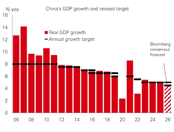 China’s stock market has been remarkably resilient in the face of rising geopolitical risks. Despite being a major energy importer – and vulnerable to commodity price shocks – China’s strategic reserves, diversified sourcing and import routes, and expanded energy mix, are providing energy resilience. No surprise then that its new Five-Year Plan (FYP) prioritises energy security, the green transition, and energy infrastructure. Policymakers ratified the FYP at the recent “Two Sessions” meetings and set a new 2026 real GDP growth target of 4.5-5.0% (from “around 5%” last year). That change is a nod to the competing demand of supporting stable economic expansion while minimising bottlenecks and risks. |