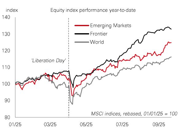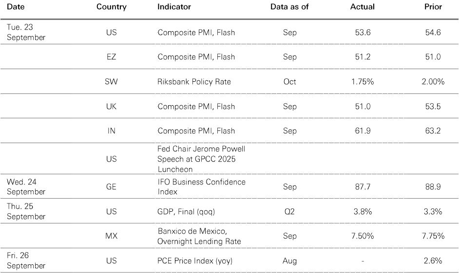 Past performance does not predict future returns. The level of yield is not guaranteed and may rise or fall in the future. For informational purposes only and should not be construed as a recommendation to invest in the specific country, product, strategy, sector, or security. Diversification does not ensure a profit or protect against loss. Any views expressed were held at the time of preparation and are subject to change without notice. Index returns assume reinvestment of all distributions and do not reflect fees or expenses. You cannot invest directly in an index. Any forecast, projection or target where provided is indicative only and is not guaranteed in any way. Source: HSBC Asset Management. Macrobond, Bloomberg. Data as at 7.30am UK time 26 September 2025.