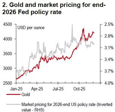 Looking ahead, the appointment of the next Fed Chair, following Jerome Powell’s term ending in May 2026, will be a key factor for markets. The new appointee is unlikely to prompt a significant hawkish policy shift, keeping the USD defensive and favouring gold in 2026 (Chart 2). In addition, persistent geopolitical, fiscal, and economic policy risks are likely to sustain upward pressure on gold, although our precious metals analyst expects heightened volatility and some price moderation in 2H26 as supply-demand dynamics evolve.