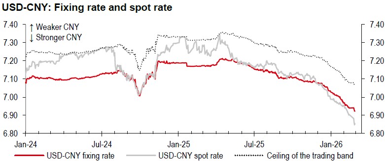 We view this adjustment not as an attempt to halt or reverse RMB appreciation, but rather to moderate its pace. Since the Lunar New Year holiday, USD-CNY fixing rates have reached new multi-year lows, and the RMB has strengthened notably against the USD. The China Foreign Exchange Trade System (CFETS) RMB Index also rose further, indicating the RMB has been strengthening against a basket of currencies. Meanwhile, the spread between the fixing and the spot rates has widened (see the chart below). Recent cross-border flows indicate that onshore corporates and investors have been selling USD at a record pace, resulting in unprecedented net short USD-CNY forward positions. In this context, the PBoC’s decision to remove the risk reserve requirement appears justified.