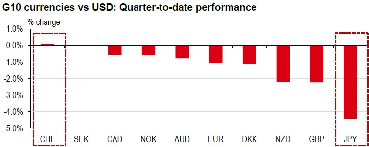 In this fourth quarter, the CHF leads as the top-performing G10 currency, with the USD close behind. In contrast, the JPY, another “safe haven” currency, is the weakest. This disparity prompts questions about the reasons for their varied performances and the potential persistence of this trend.