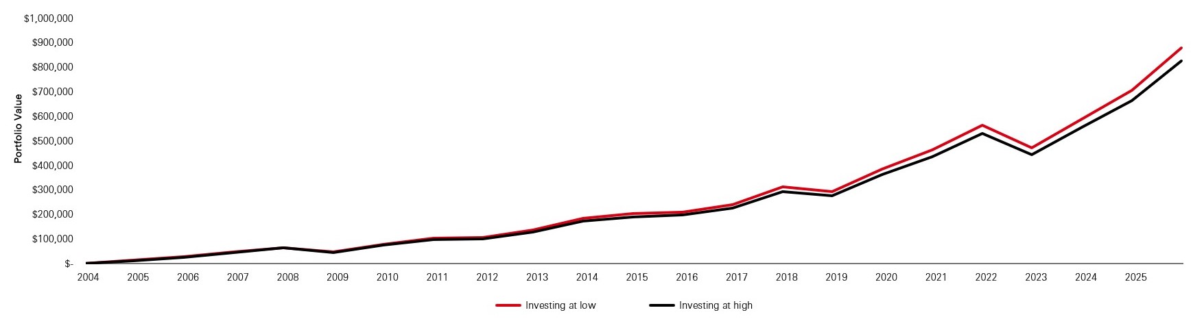 Source: Bloomberg, HSBC Asset Management. Investing = MSCI AWCI Net Return Index, 1 January 2004 to 31 December 2025. Past performance is no guarantee of future returns.